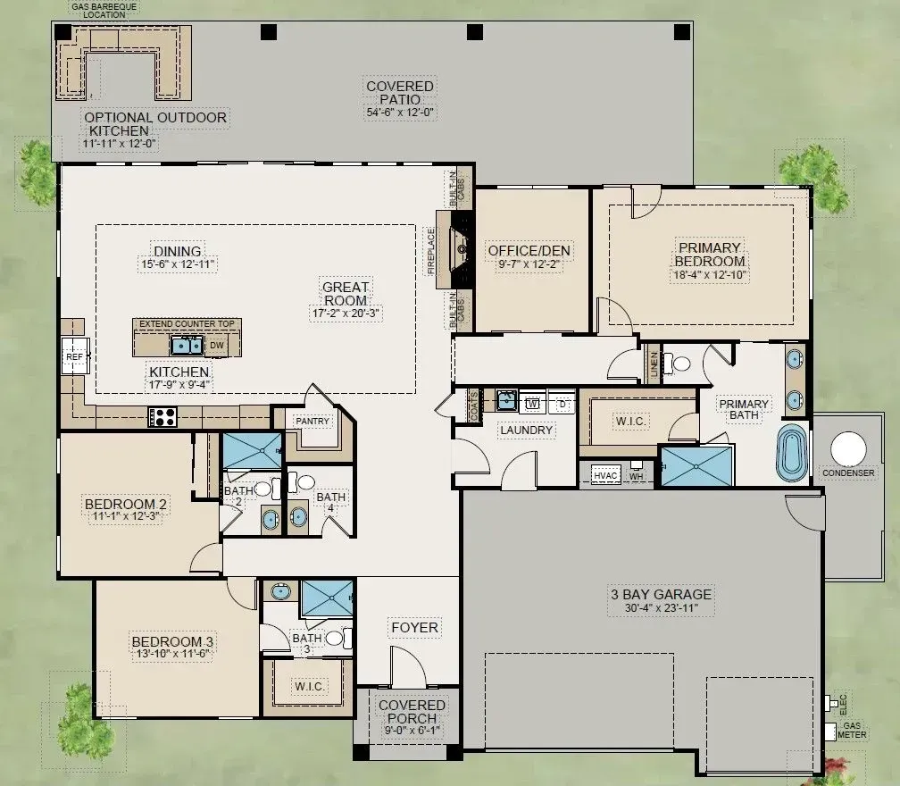 The kitchen flows seamlessly into the dining room and great room, which features a cozy fireplace—ideal for gathering around during the holidays or cozy nights in.